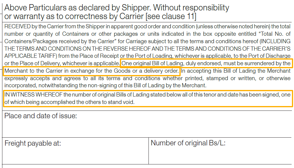 如果您查看突出顯示的部分,您可以看到在出示簽發(fā)的正本提單數(shù)量的 1 份后,可以向授權(quán)收貨人授予放貨(交貨單)。