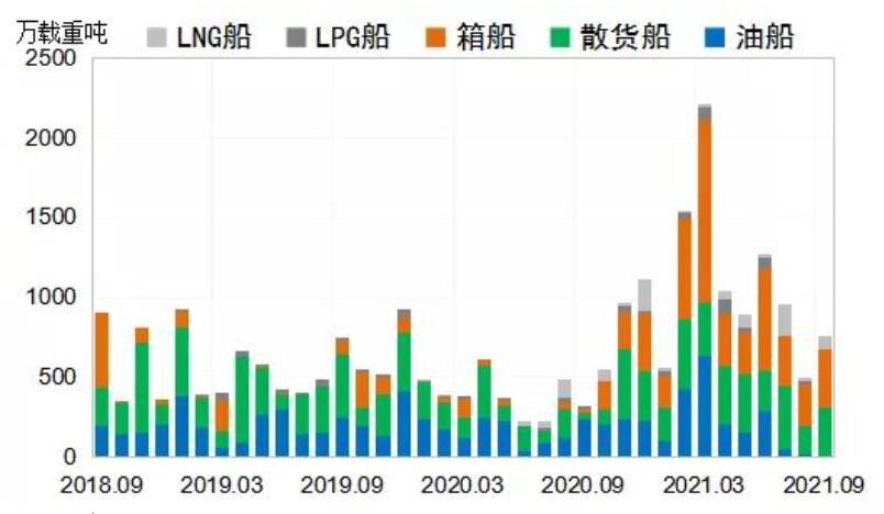 對(duì)船舶的大量需求。九月份,新船需求量依然較大,全球簽約量133艘,達(dá)到781.6萬(wàn)噸,按載重噸計(jì)算,比上年增加50.2%,比上年增加128.7%。短時(shí)間內(nèi),全球新船需求依然活躍,預(yù)計(jì)全年新船量將達(dá)到1.2億噸。