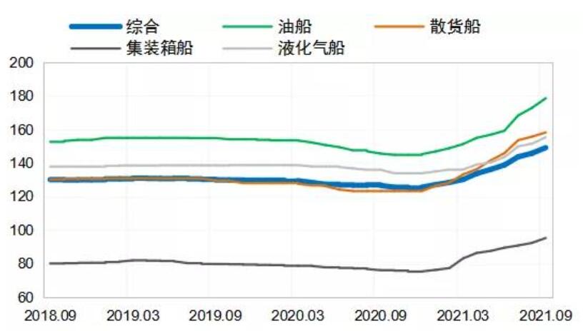 新貨價(jià)又創(chuàng)新高。九月份,Clarkson-support的船舶價(jià)格指數(shù)以較大幅度的回落3.3個(gè)百分點(diǎn),達(dá)到149.1點(diǎn)。以散貨船、油船、集裝箱船、液化氣船為主,克拉克森新船價(jià)格指數(shù)分別為158.2點(diǎn)和178.5點(diǎn),其中95.3和155.3點(diǎn),比上月上升2.5點(diǎn)、5.7點(diǎn)、2.9點(diǎn)和3.8點(diǎn),分別上升34.9點(diǎn),32.9、19.2和19.3。就典型船型而言,9月份各典型船型新船價(jià)格持續(xù)走高,其中VLCC、大型LNG船的價(jià)格漲幅分別為350萬(wàn)美元和400萬(wàn)美元,其它船型也有不同程度的上漲。